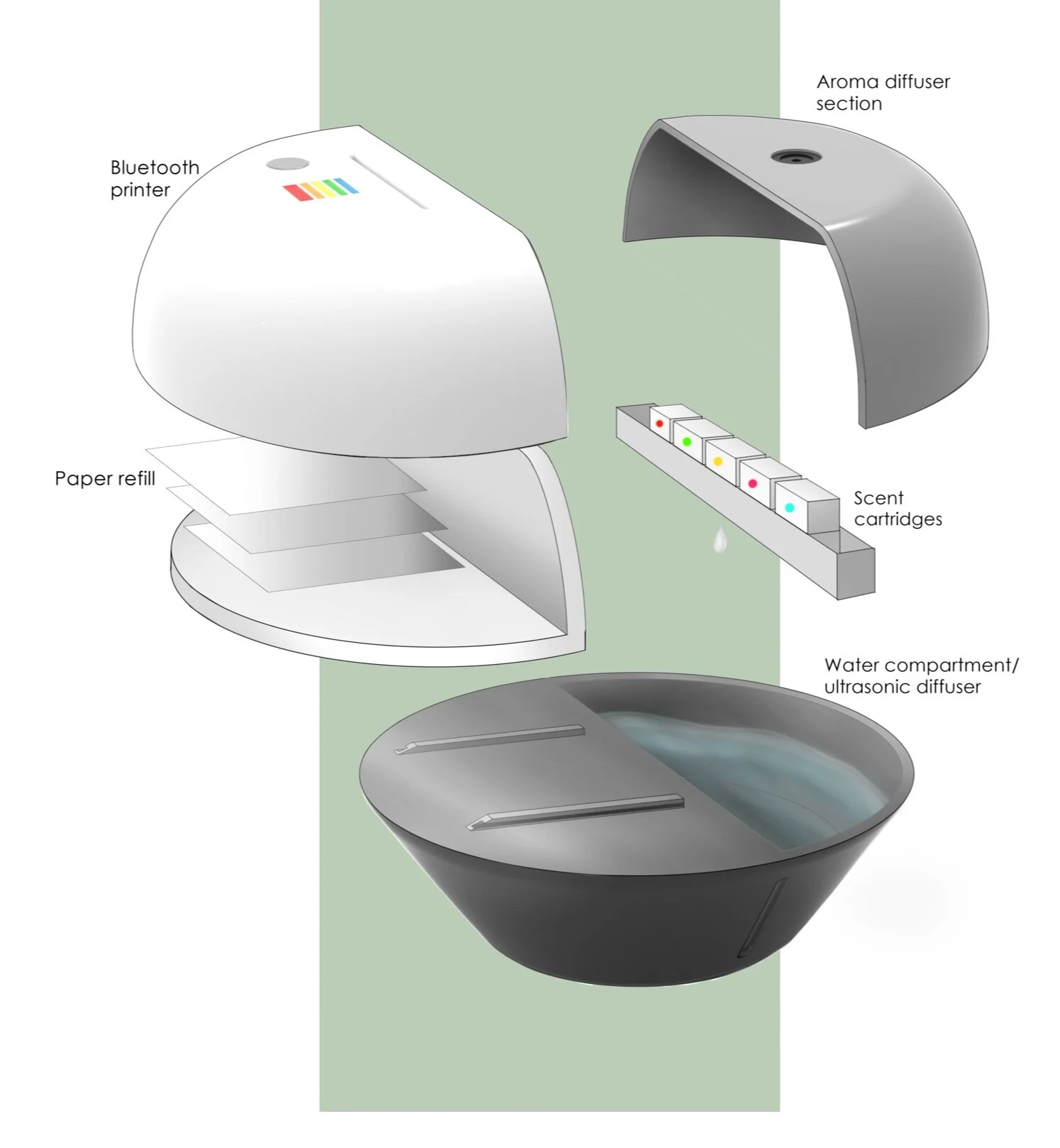 An aroma diffuser and photo printer that combines the Polaroid brand and the concept of healthy living in a product that utilizes the visual and olfactory senses to promote positive nostalgic thoughts.