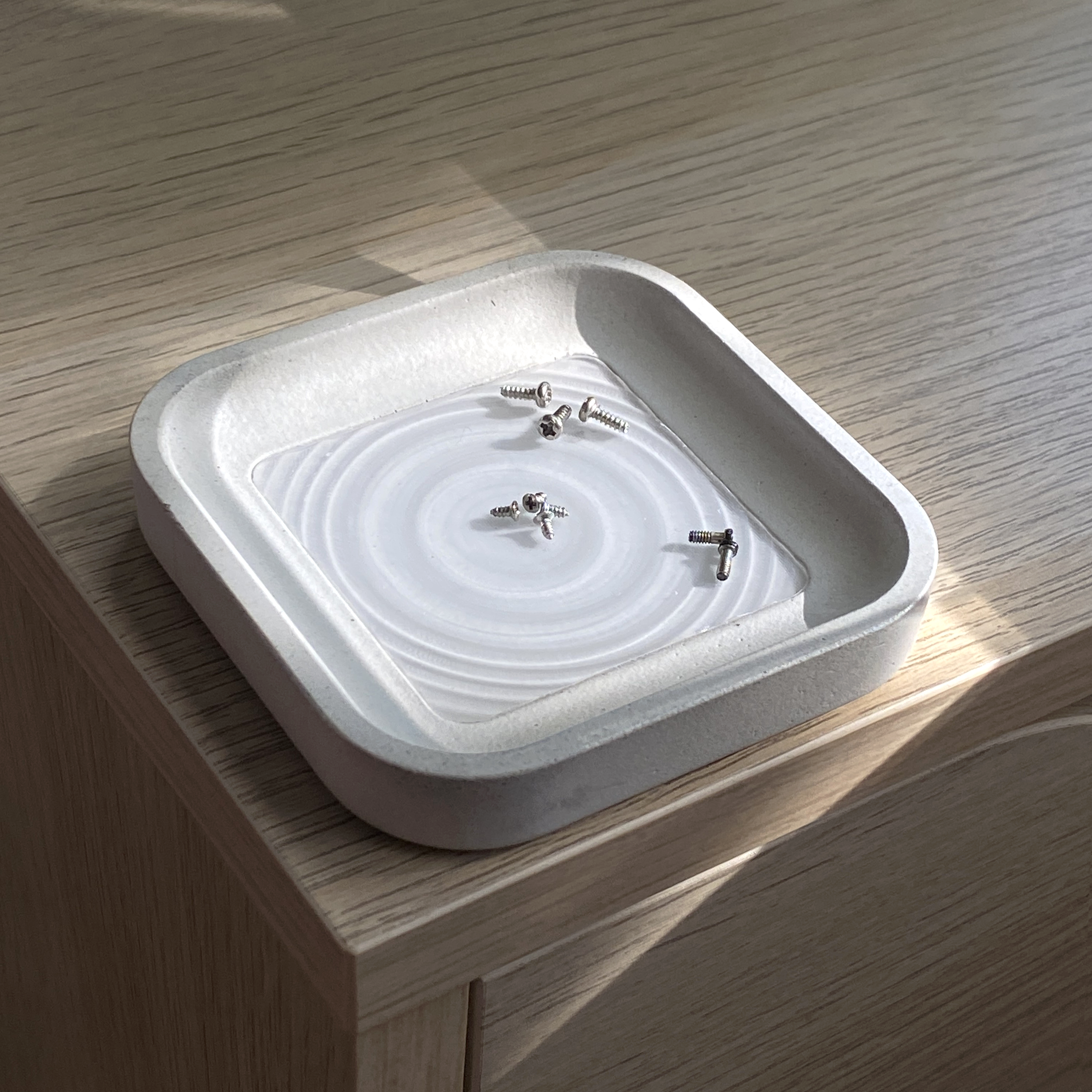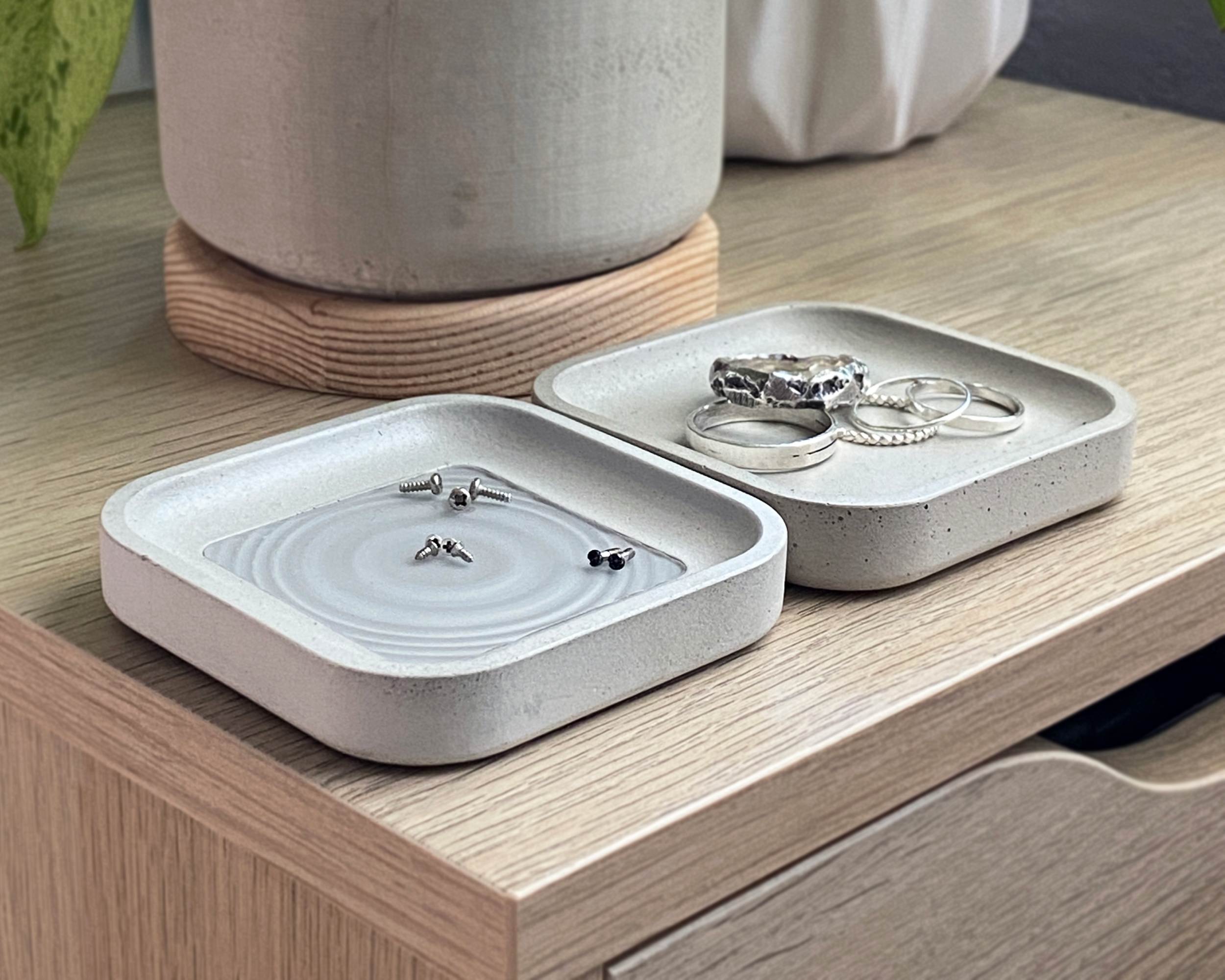 A rounded square concrete tray to hold any trinkets, jewelry, or parts you'd like it to hold.